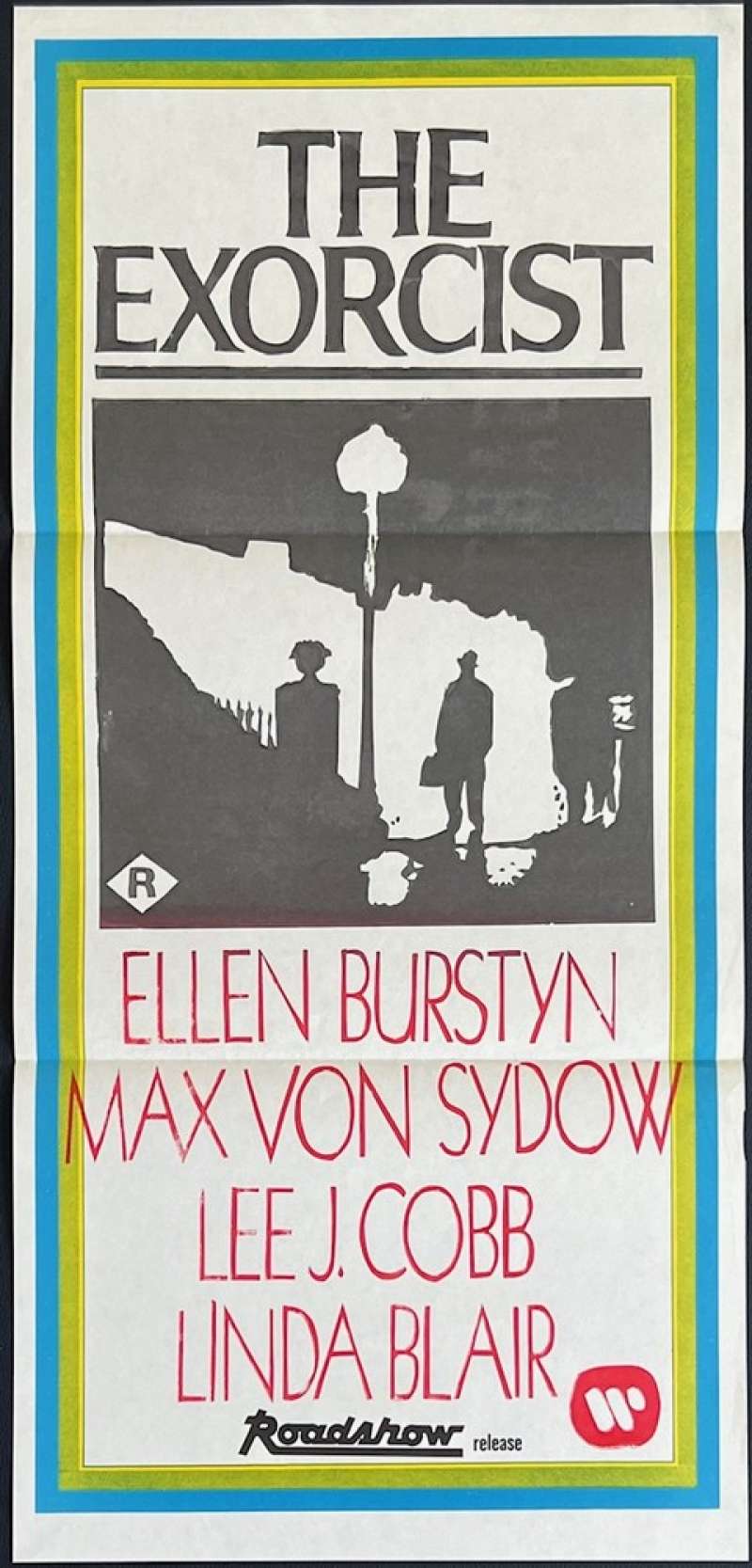 The Exorcist Poster Daybill Rare Art Re-Issue Linda Blair.The Exorcist is a 1973 American supernatural horror-drama film directed by William Friedkin, adapted by William Peter Blatty from his 1971 novel of the same name. The book, inspired by the 1949 exorcism of Roland Doe, deals with the demonic possession of a 12-year-old girl and her mother's attempts to win back her child through an exorcism conducted by two priests. The adaption is relatively faithful to the book, which itself has been commercially successful (hitting the New York Times bestseller list). The movie features performances from Linda Blair, Ellen Burstyn, Jason Miller, Max von Sydow, and (in voice only) Mercedes McCambridge. The film experienced a troubled production; even in the beginning, several prestigious film directors including Stanley Kubrick and Arthur Penn turned it down however director William Friedkin came on board given the acclaim of his previous film, The French Connection. Rarely does an original Daybill movie poster become available for this title.